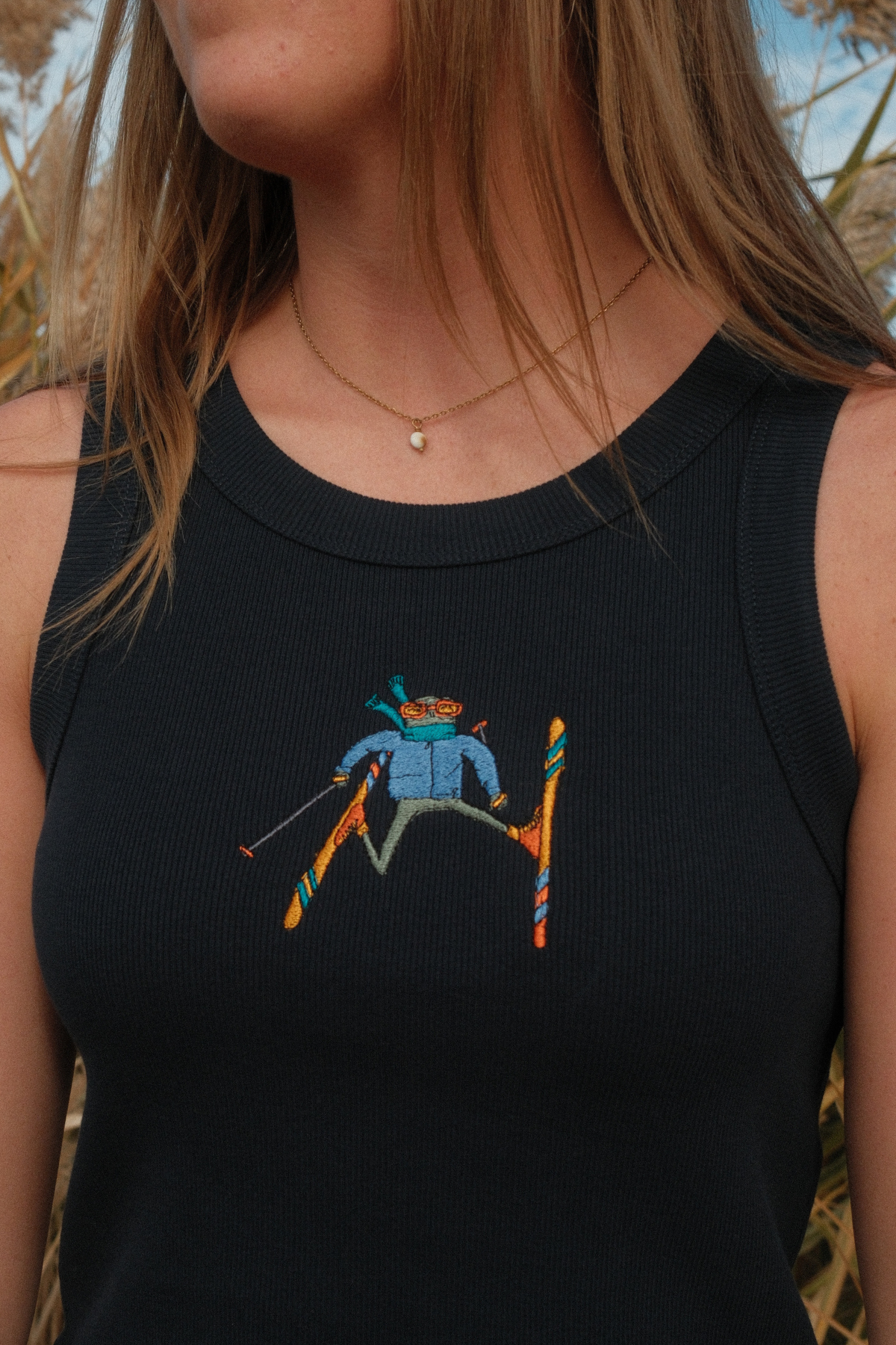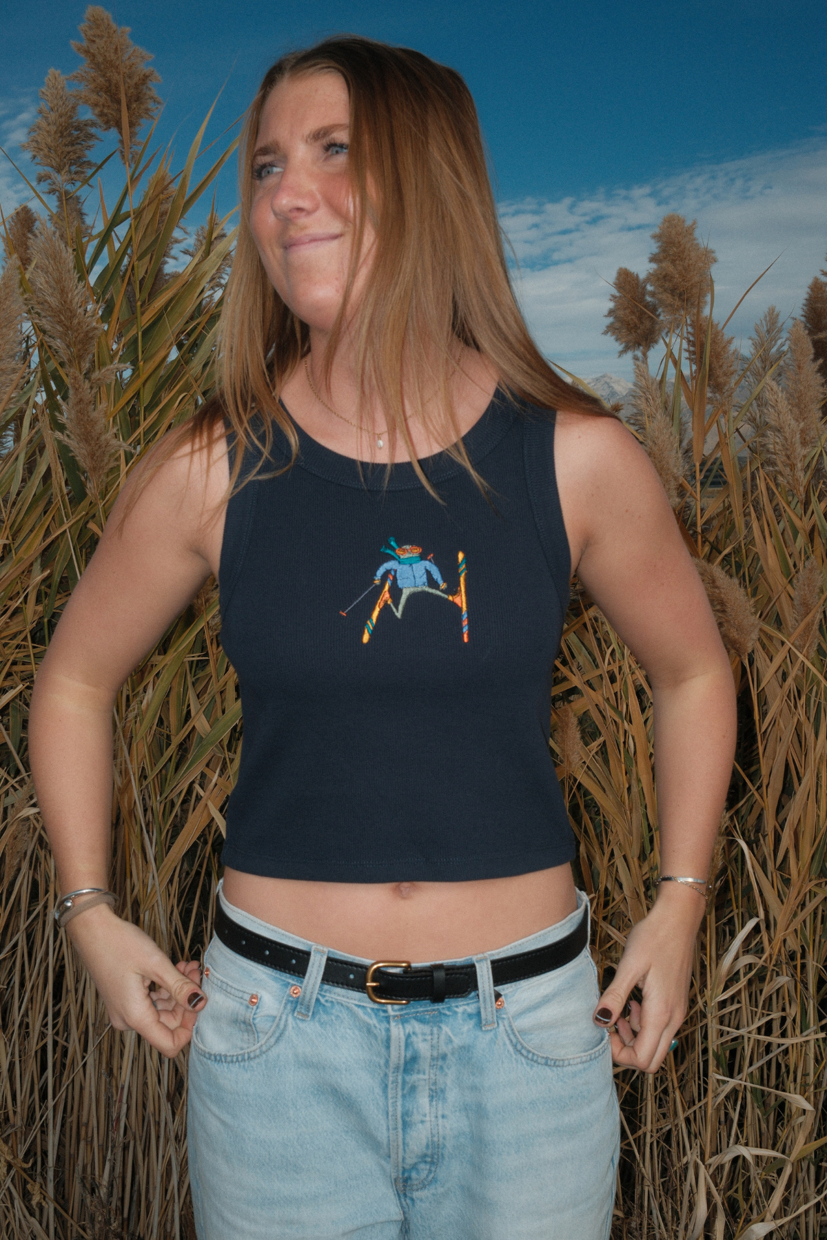 - Self fabric wide binding, 2x2 rib, double needle hem, crop length