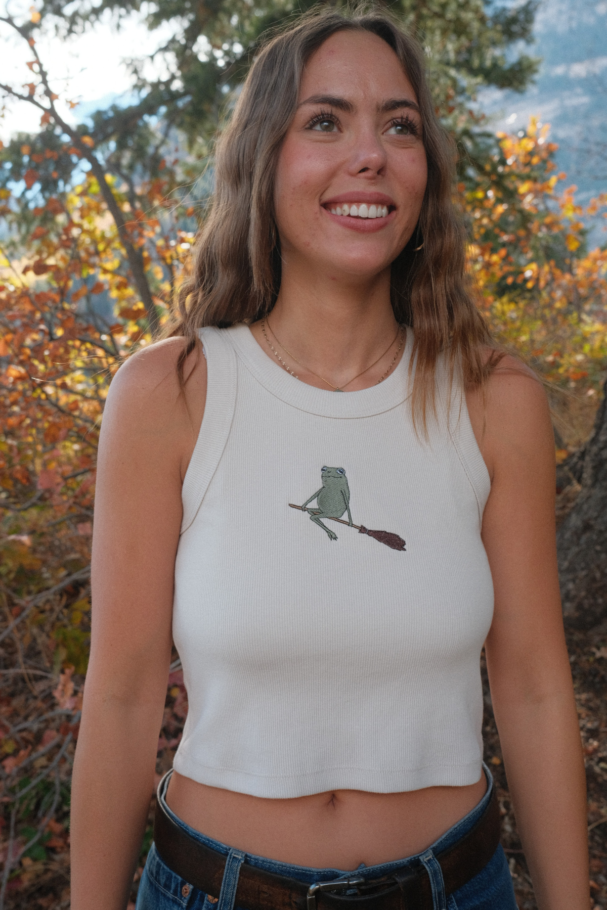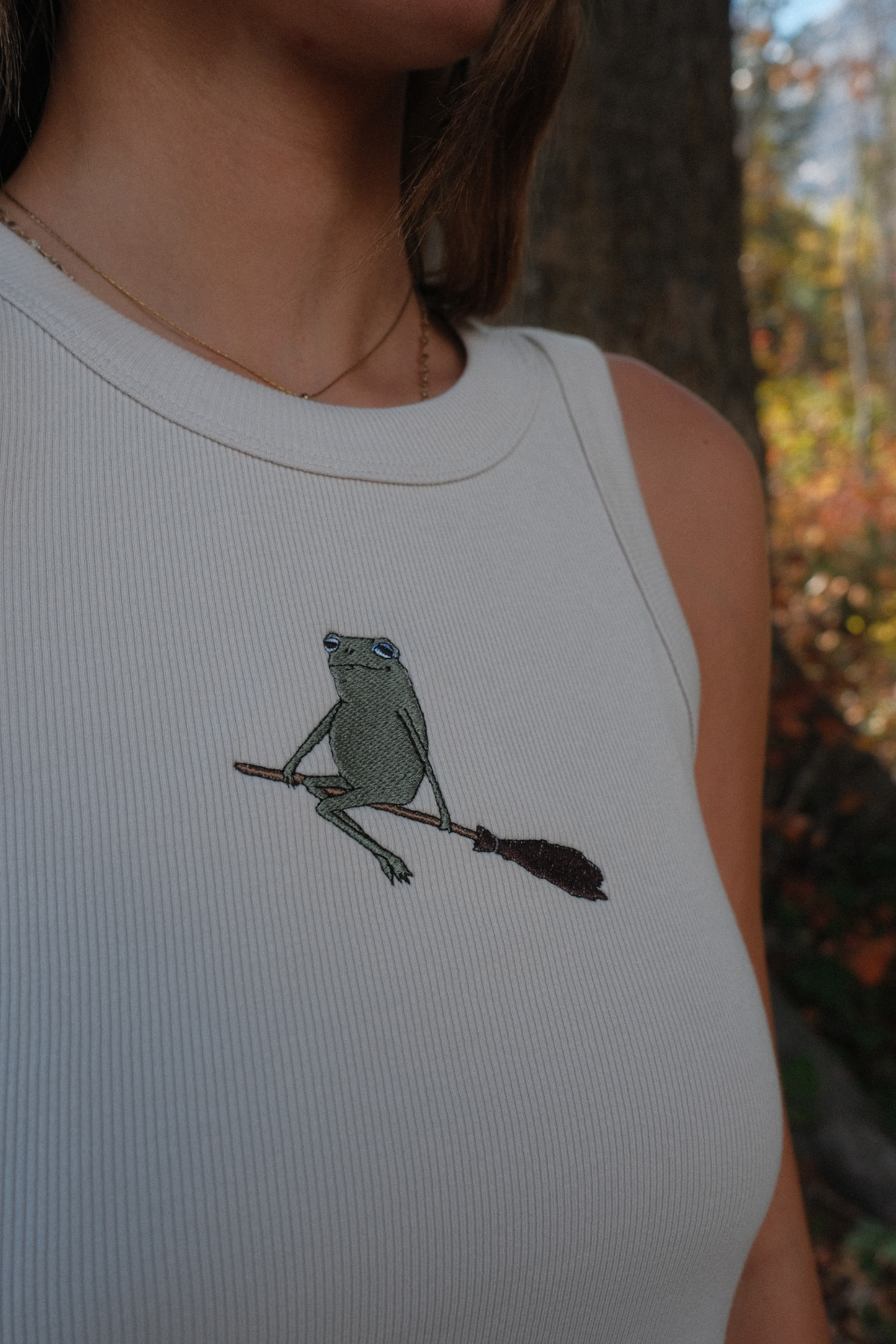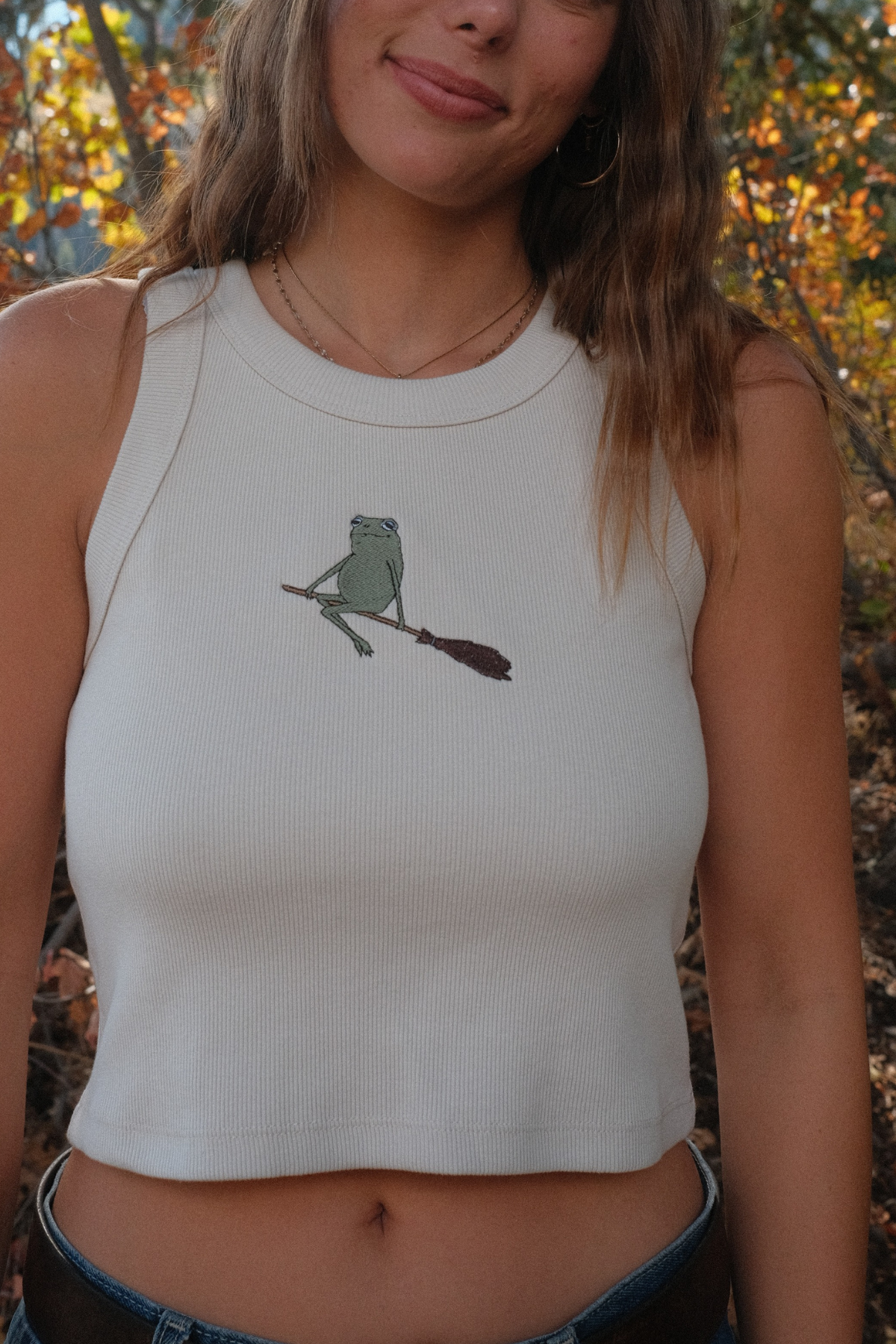 - Self fabric wide binding, 2x2 rib, double needle hem, crop length