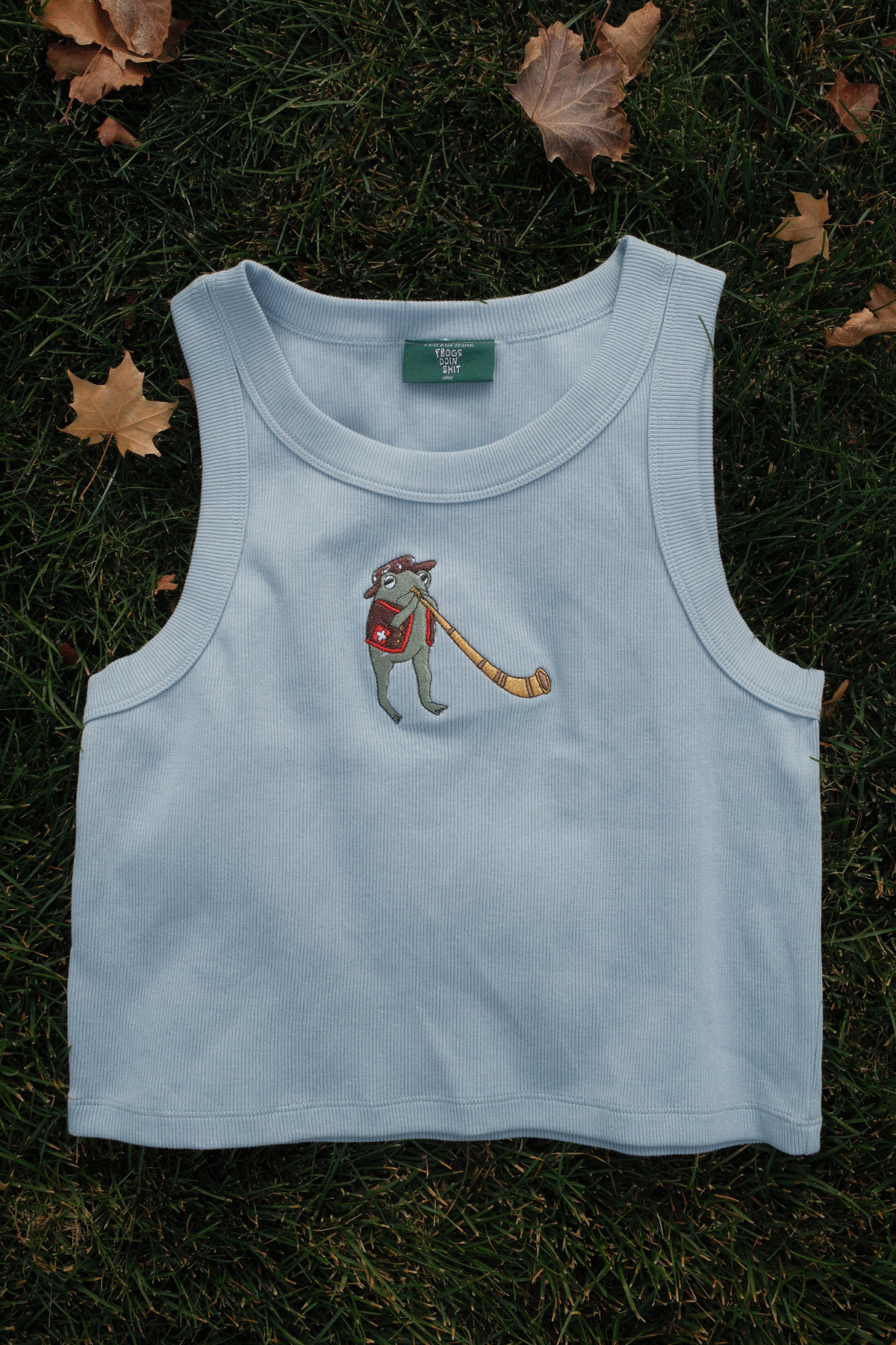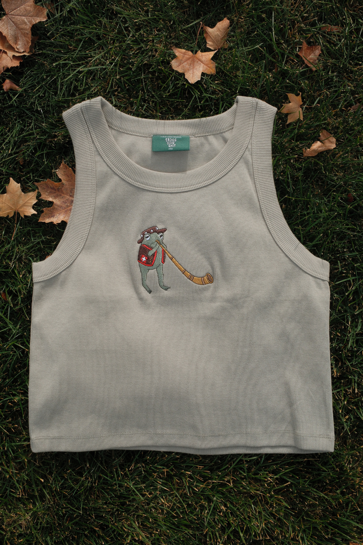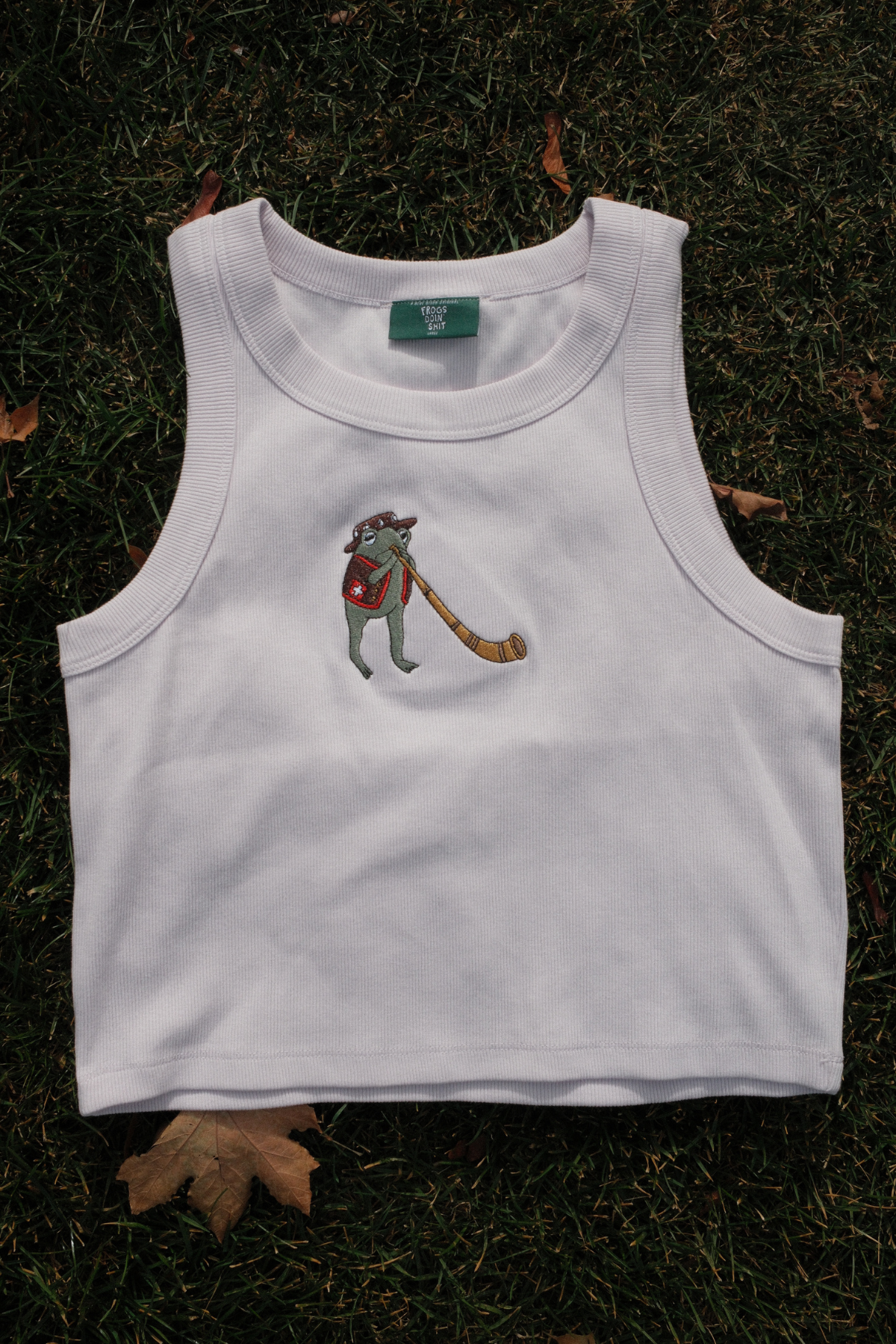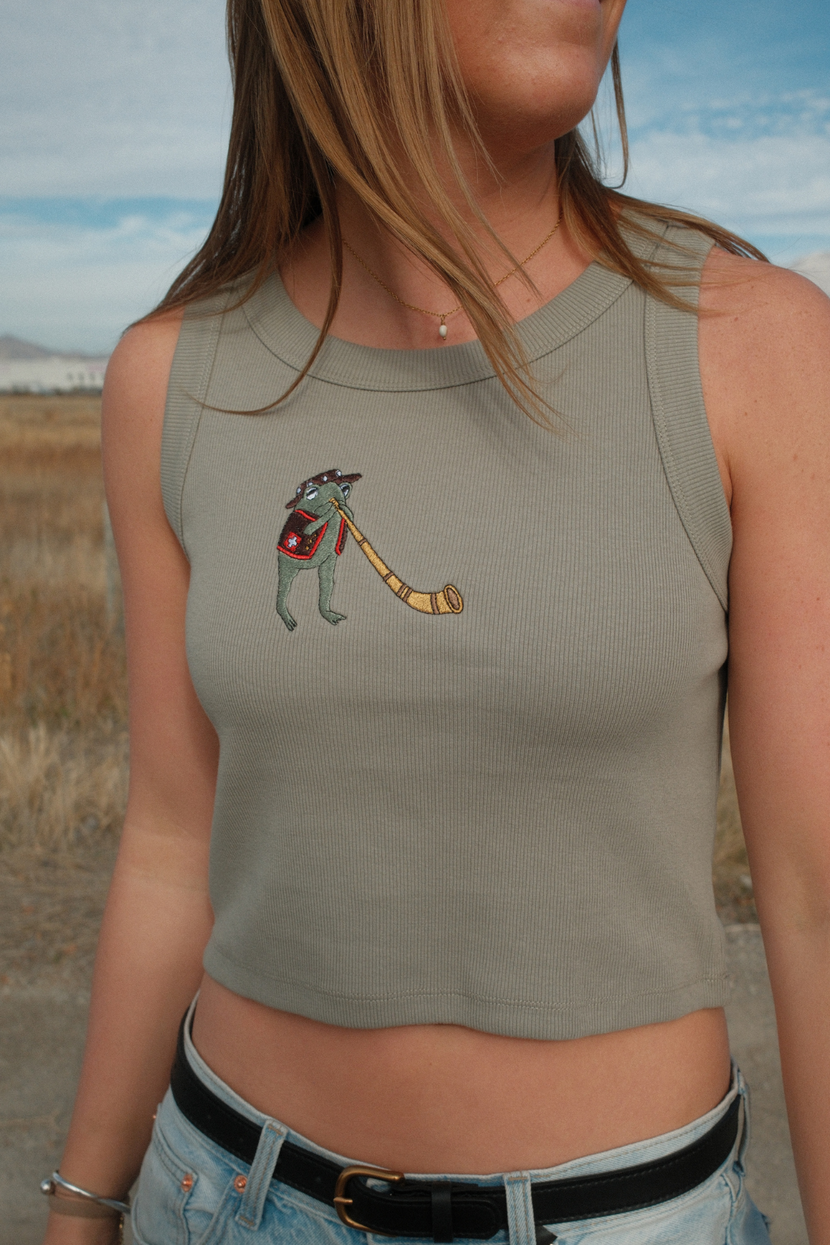 - Self fabric wide binding, 2x2 rib, double needle hem, crop length