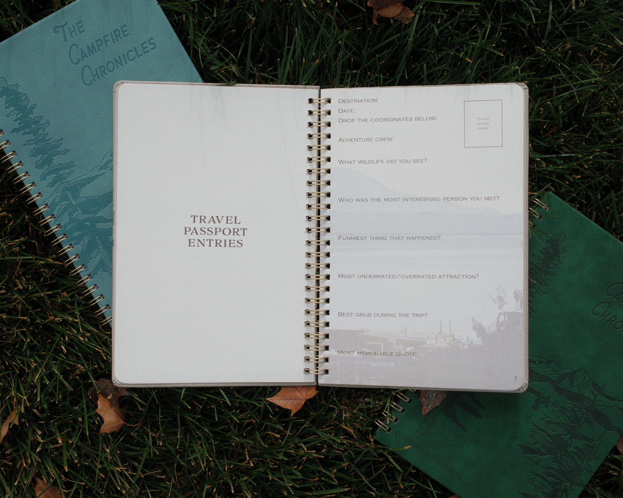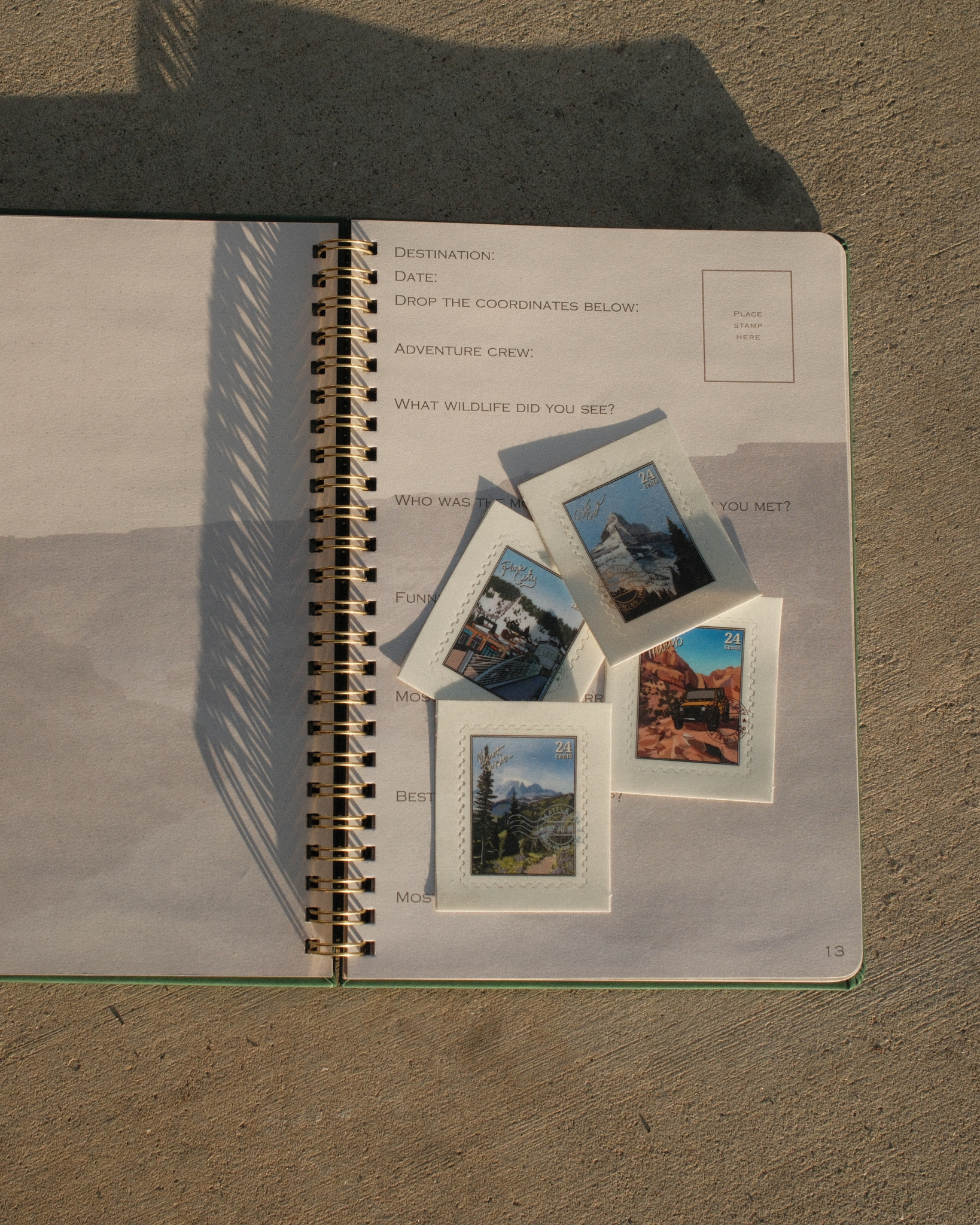 Each entry includes guided prompts, a designated spot to place one of our sticker stamps from wherever you traveled, and three blank pages for extra notes, sketches, or anything you want to remember.
