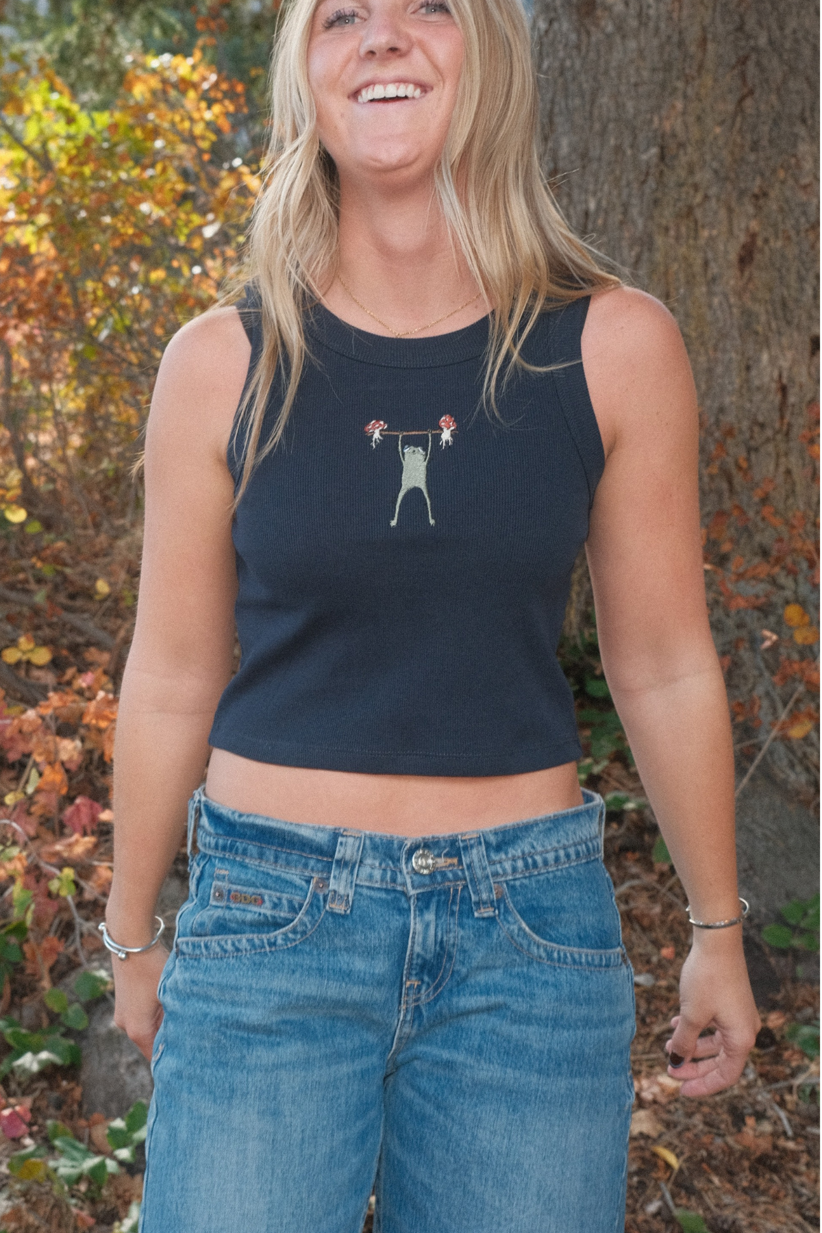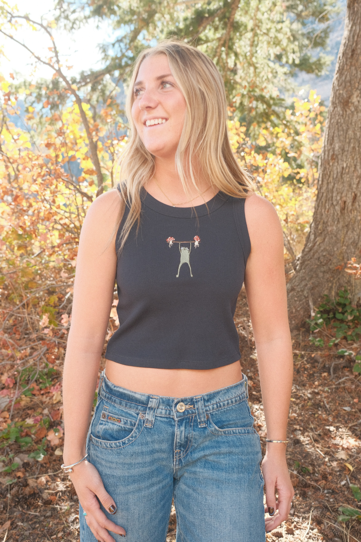 - Self fabric wide binding, 2x2 rib, double needle hem, crop length